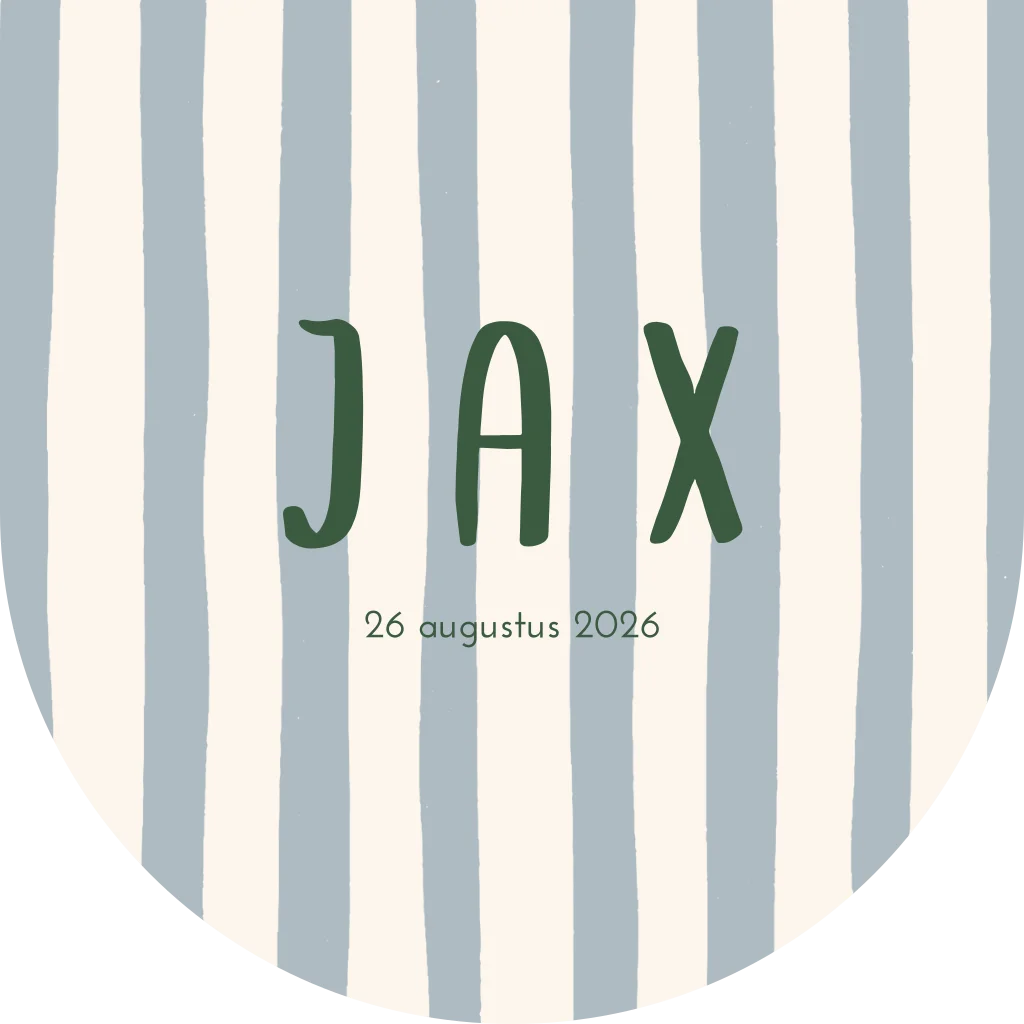 Vierkant gevouwen geboortekaartje met unieke boogvorm onderkant en speels streepjes patroon. De vrolijke blauwe en groene kleuren zijn ook aan te passen naar wens.