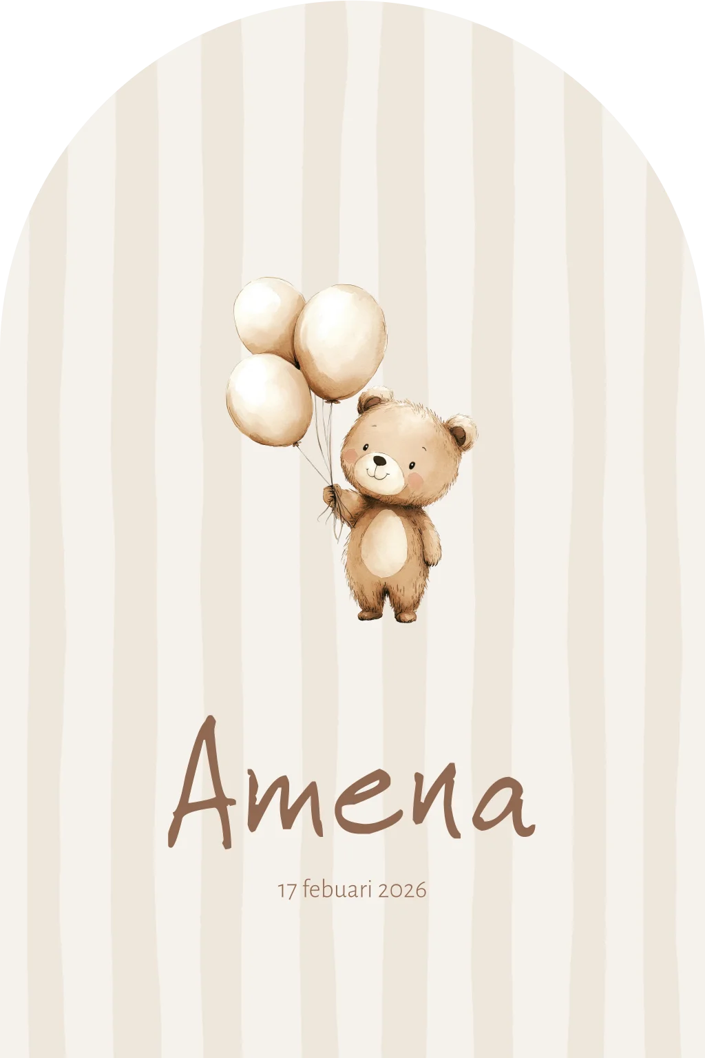 gevouwen boogvorm geboortekaartje met trendy streepjes patroon in zachte beige tinten en een lief geschilderd beertje met ballonnen in de hand. Ook mogelijk in alle andere vormen & formaten.