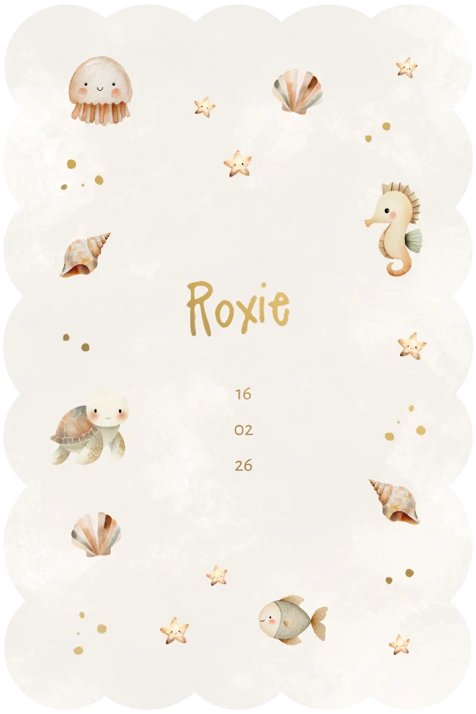Een lief geboortekaartje met aquarel baby zeedieren in vrolijke golfjes vorm. De nieuwe trendy mat goudfolie maakt het kaartje helemaal af.