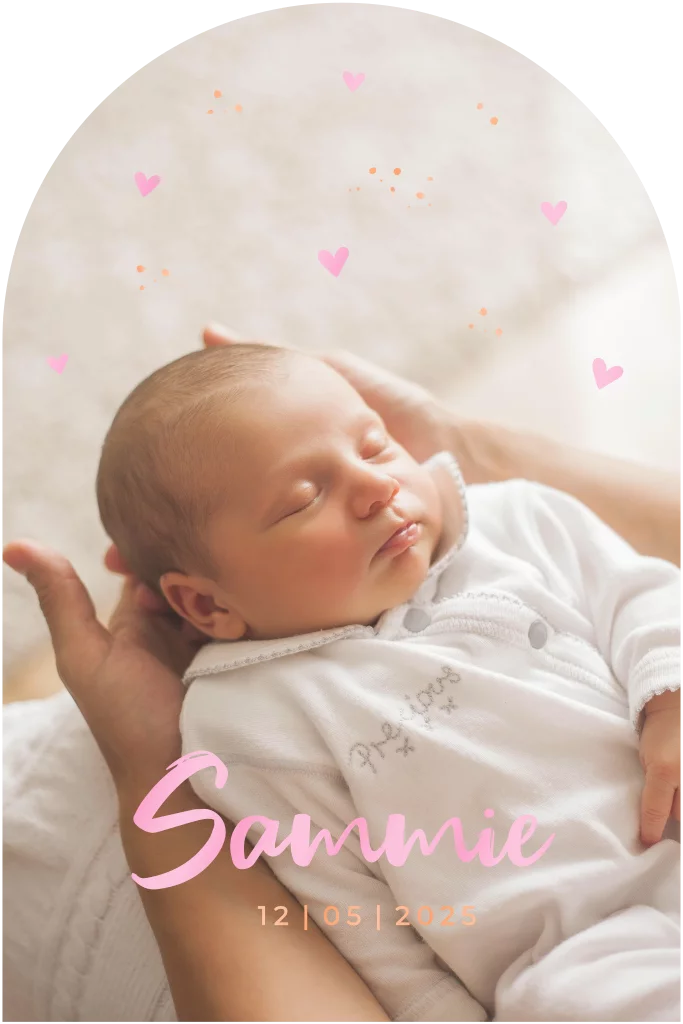 Dit originele en lieve geboortekaartje is perfect voor de aankondiging van de geboorte van jullie zoon of dochter. Met ruimte voor één foto van jullie kleine wonder, straalt dit kaartje liefde en warmte uit. De boogvorm en glimmende roze en oranje hartjes geven het kaartje een speelse en vrolijke uitstraling, perfect passend bij de blijdschap van de geboorte van jullie jongen of meisje.