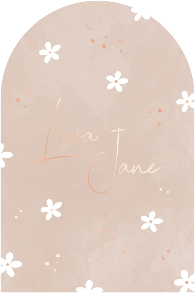 Lief geboortekaartje voor een meisje met prachtige blush roze kleuren en rosefolie. De witte bloemetjes en rosefolie spetters geven het kaartje een zachte en lieflijke uitstraling, perfect passend bij de lente en de geboorte van een nieuw leven. Met de bijzondere boogvorm valt het kaartje extra op.