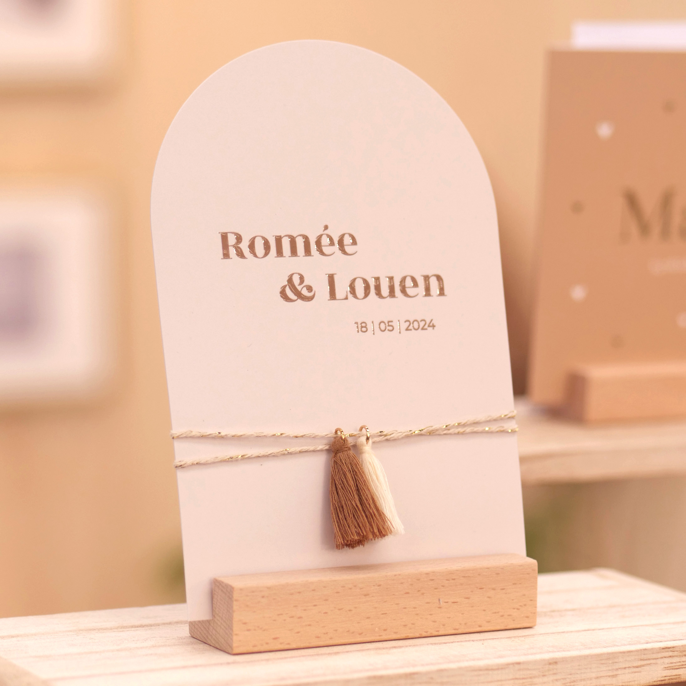 Hte krijgen van een tweeling is een dubbel wonder! Dat verdient ook een extra bijzonder geboortekaartje. Ga voor dit originele kaartje in boogvorm afgemaakt met touw & tassels.