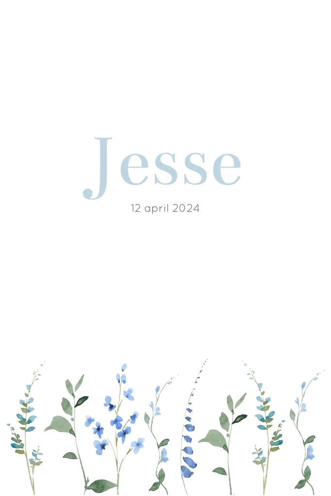 Geboortekaartje voor een jongen in een boogvorm met mooie blauwe bloemen. De blauwe bloemen en de boogvorm geven deze kaart een klassieke look. Het kaartje is nog naar eigen smaak aan te passen in de editor.