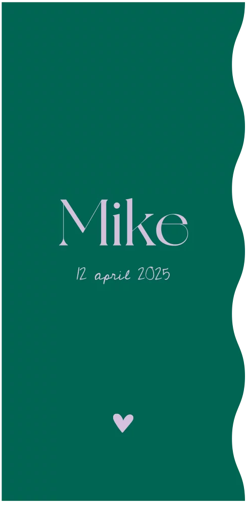 Verwelkom jullie kindje met dit moderne en speelse geboortekaartje! Het langwerpige kaartje heeft een unieke wavevorm in groen en paars, met een liefdevol hartje. Perfect voor ouders die een eigentijdse en stijlvolle aankondiging willen.