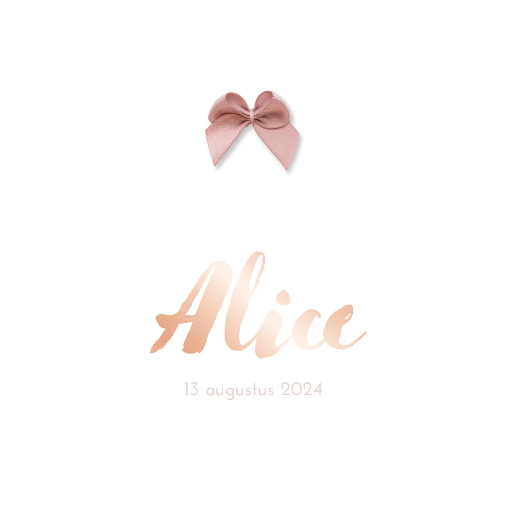 LET OP: het roze strikje op dit kaartje wordt NIET standaard meegeleverd of op het kaartje gedrukt. Dit in enkel ter voorbeeld zodat je een goed beeld krijg van het uiteindelijke kaartje. Het ouderoze strikje (of andere kleuren) kun je hier los bestellen. TIP: Bestel bij de proefdruk een voorbeeldsetje van alle strikjes om alvast uit te proberen.