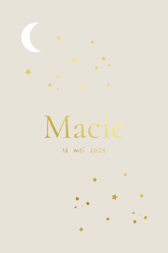 Maak kennis met dit bijzondere geboortekaartje met een uniek uitgesneden maantje als speciaal effect. De schitterende goudfolie sterretjes zorgen voor een magische en feestelijke uitstraling. De zachte, rustige beige achtergrond maakt het ontwerp warm en stijlvol, perfect voor een liefdevolle geboorteaankondiging. Personaliseer het kaartje eenvoudig zelf in onze online editor en geef het een persoonlijk tintje.