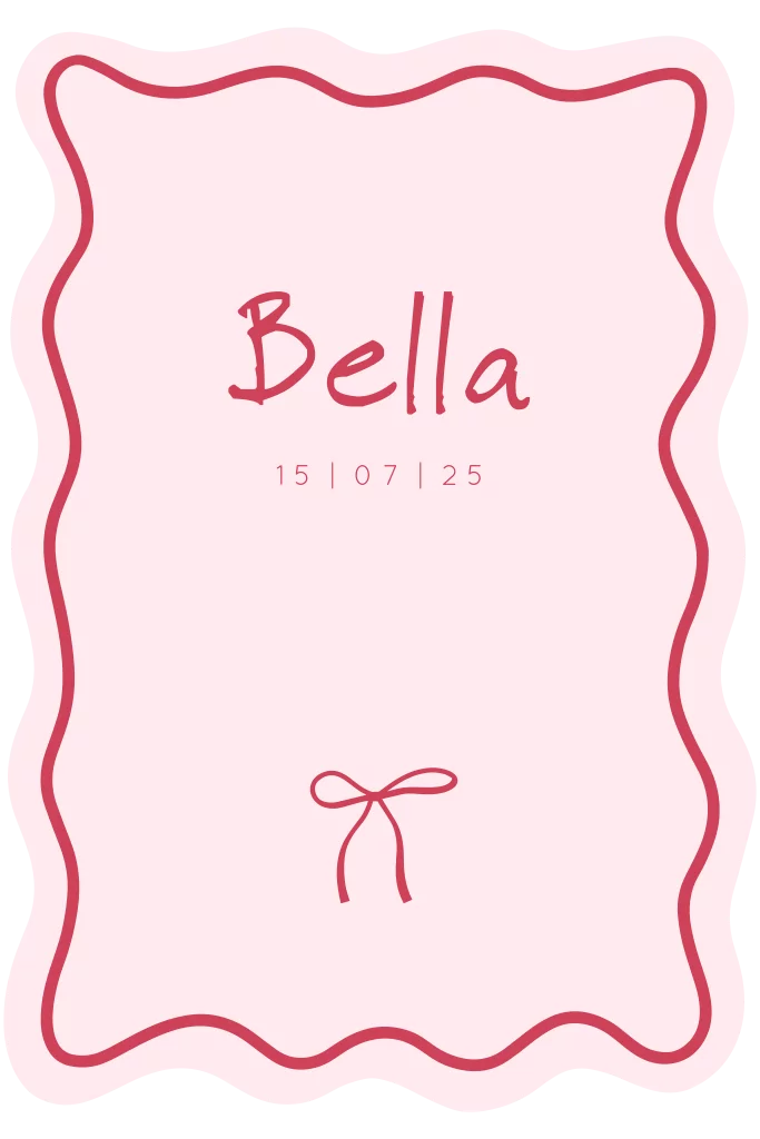 Getekende strikjes zijn de trend van 2025! Samen met deze originele organische wave vorm kies je met dit geboortekaartje voor een unieke en echt andere aankondinging voor jullie dochter. De lieve en zachte rood roze kleuren zijn gemakkelijk aan te passen naar wens. Ook mogelijk in een ander formaat of met folie.