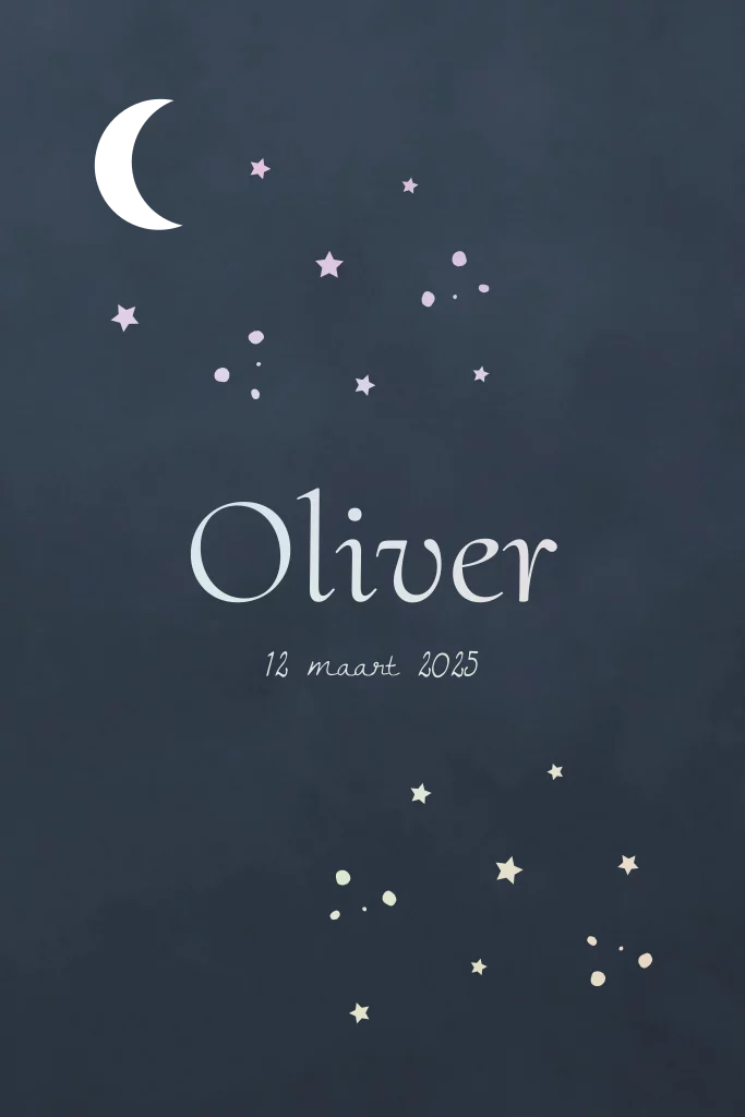Ontdek dit bijzondere geboortekaartje voor een jongen met een uniek uitgesneden maantje dat een speciaal effect creëert. De holografische folie zorgt voor een magisch, sprankelend detail, terwijl de blauwe achtergrond het ontwerp een zachte en stijlvolle uitstraling geeft. Perfect voor ouders die op zoek zijn naar een origineel en elegant kaartje om de geboorte van hun zoon te vieren. Personaliseer eenvoudig in onze online editor.