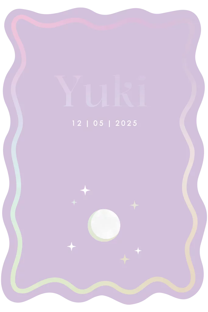 Vier de geboorte van jullie kleintje met dit bijzondere geboortekaartje in een trendy wave vorm. Het kaartje heeft een zachte lila kleur, afgewerkt met holografische folie voor een sprankelend en magisch effect. De illustratie van een maan en sterretjes geeft het ontwerp een dromerige uitstraling.
