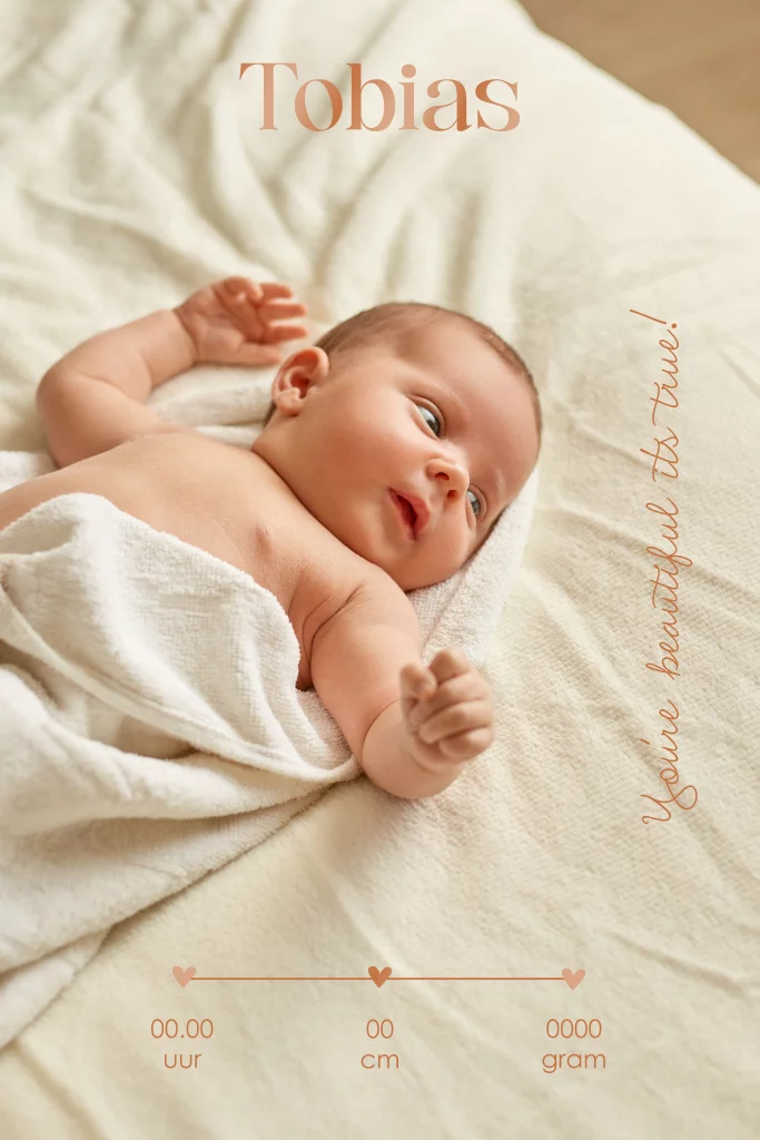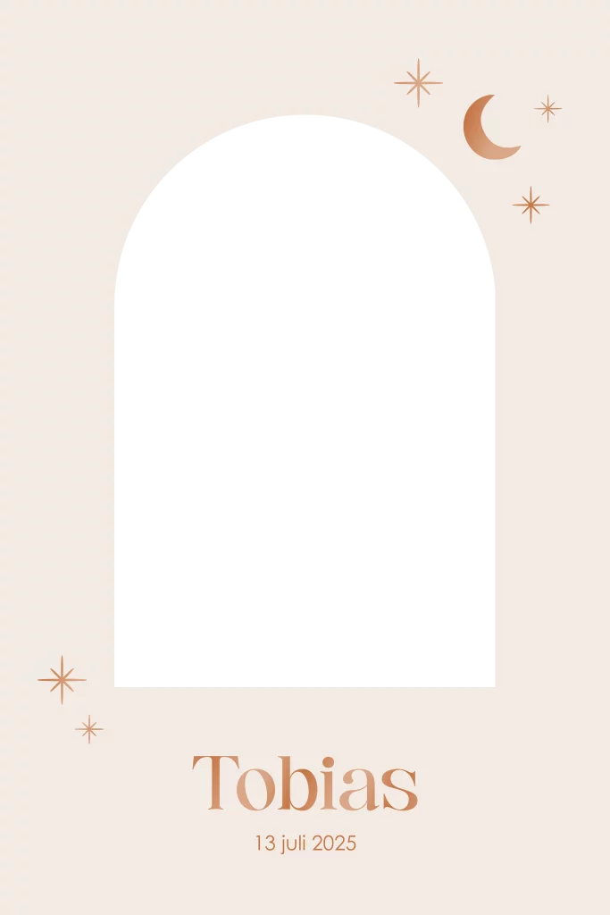 Uniek geboortekaartje met een schitterende koperkleurige hoogglans maan en sterretjes. Het boogvormige doorkijkje maakt het mogelijk om de foto van jullie kindje op een bijzondere en persoonlijke manier te tonen. Een stijlvol en opvallend ontwerp dat jullie geboorteaankondiging extra speciaal maakt.