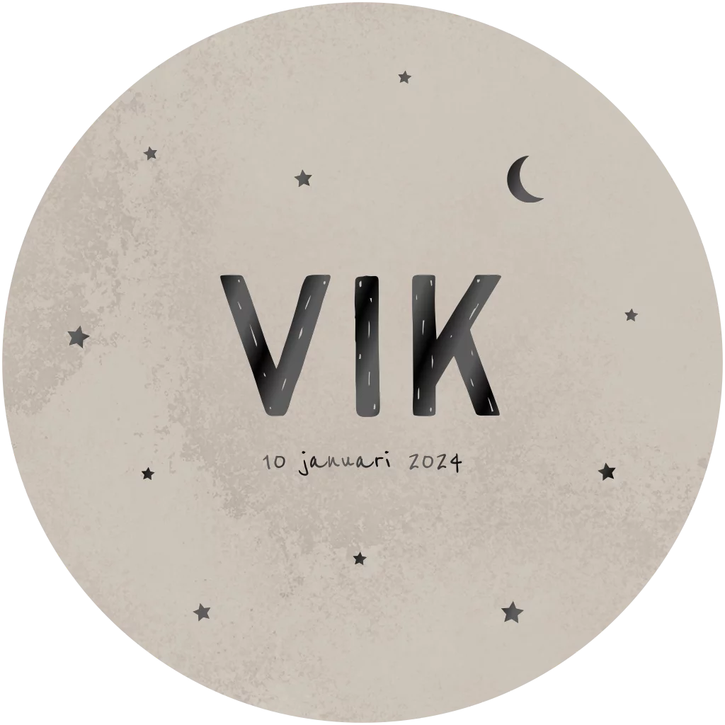 Rond geboortekaartje met beige brush achtergrond en stoere zwartfolie sterren en een maan. Je kunt het kaartje gemakkelijk aanpassen naar wens door het kiezen van een ander lettertype, folie- of achtergrondkleur.