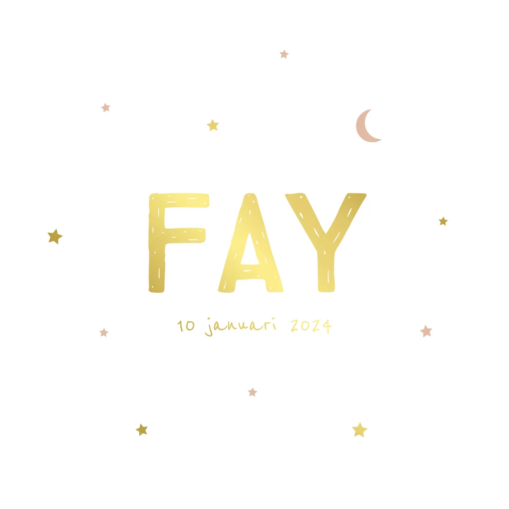 Rond geboortekaartje met goudfolie sterretjes en een maantje. Je kunt het kaartje gemakkelijk aanpassen naar wens door het kiezen van een andere folie- of achtergrondkleur, een ander lettertype te gebruiken of de sterretjes te vervangen voor bijvoorbeeld bloemen.