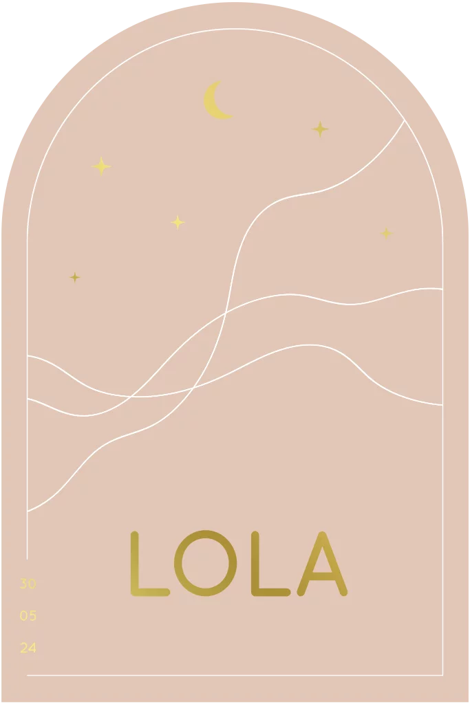 Maak kennis met dit bijzondere geboortekaartje voor een meisje, uitgevoerd in een elegante boogvorm met abstracte lijnen. Het ontwerp wordt sfeervol afgemaakt met een gouden folie maan en speelse sterretjes voor een stijlvolle en unieke uitstraling.