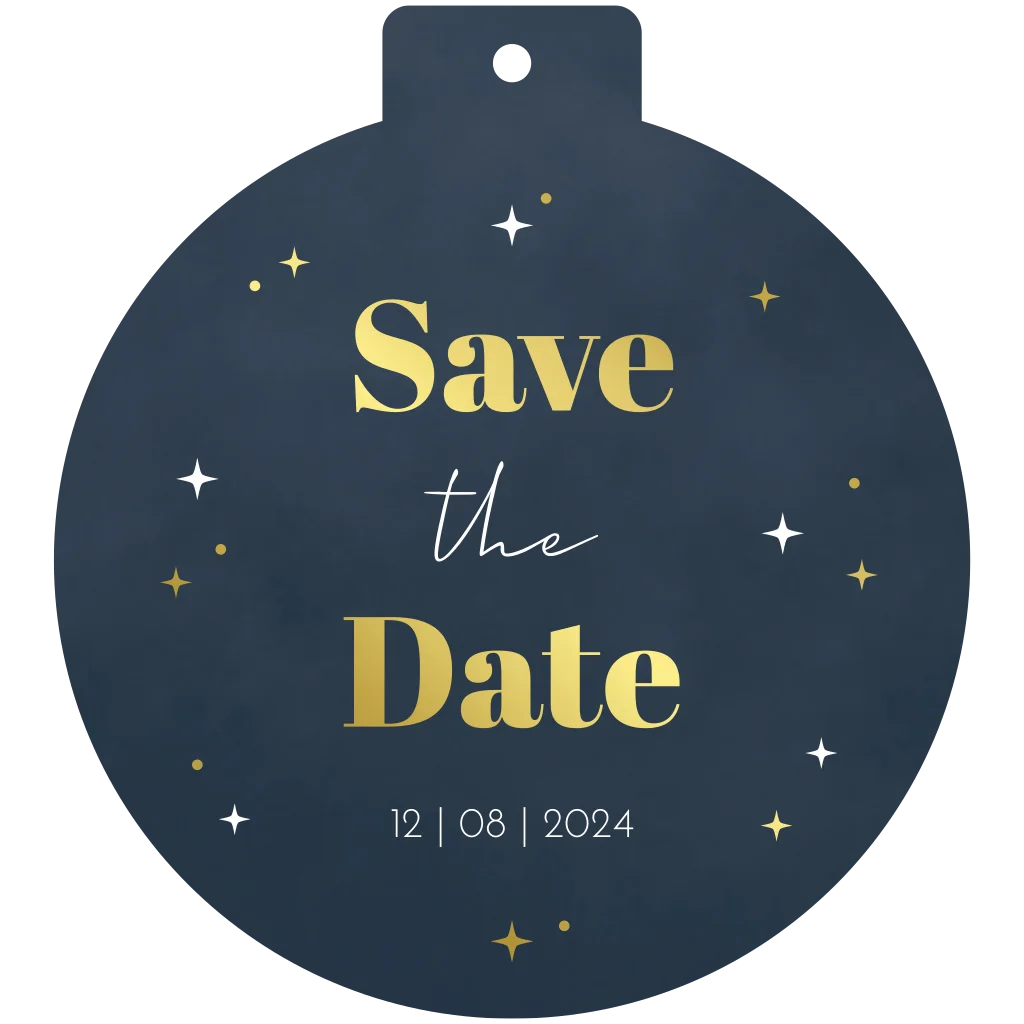 Verras je gasten met deze unieke Save the Date kaart in de vorm van een kerstbal, perfect om te versturen als kerstkaart. Pas eenvoudig zelf de achtergrondkleur en het lettertype aan in de editor voor een persoonlijke touch.
