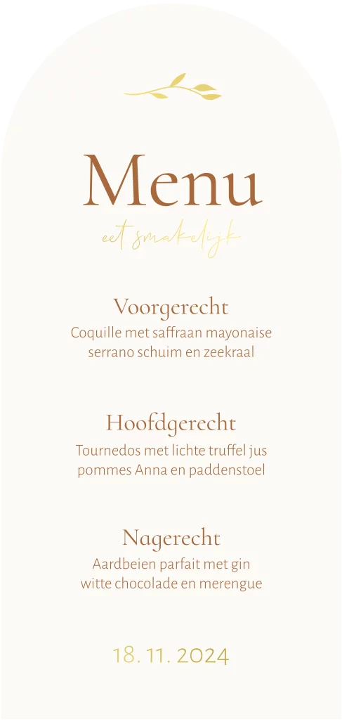 Ben je op zoek naar een stijlvolle en unieke menukaart voor je bruiloft, diner of ander speciaal evenement? Deze prachtige menukaart in boho chic stijl, met een boogvormig ontwerp en gouden details, is een echte eyecatcher op elke tafel. Personaliseer de menukaart eenvoudig met jullie menu en creëer een onvergetelijke ervaring voor je gasten.