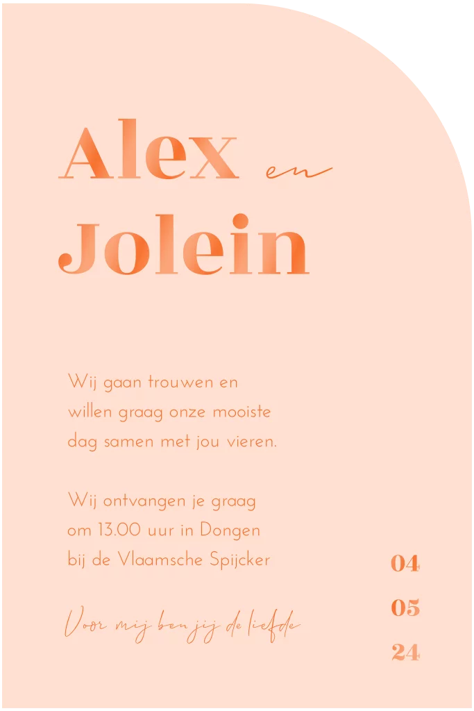 Trouwkaart halve boogvorm zomers oranje hoogglans