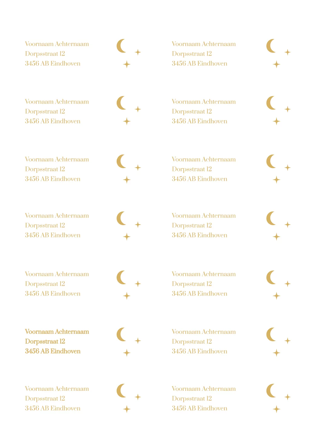 Deze goudgele adresstickers met een maan en sterretjes zijn de perfecte aanvulling op jullie geboortekaartjes! Ze zijn verkrijgbaar in dezelfde stijl en kleuren als de kaartjes, waardoor alles mooi op elkaar aansluit. Bestel de stickers samen met je enveloppen, zodat je alles van tevoren kunt regelen en direct aan de slag kunt. Personaliseer de stickers met de adressen van je gasten en maak je geboortepost compleet!