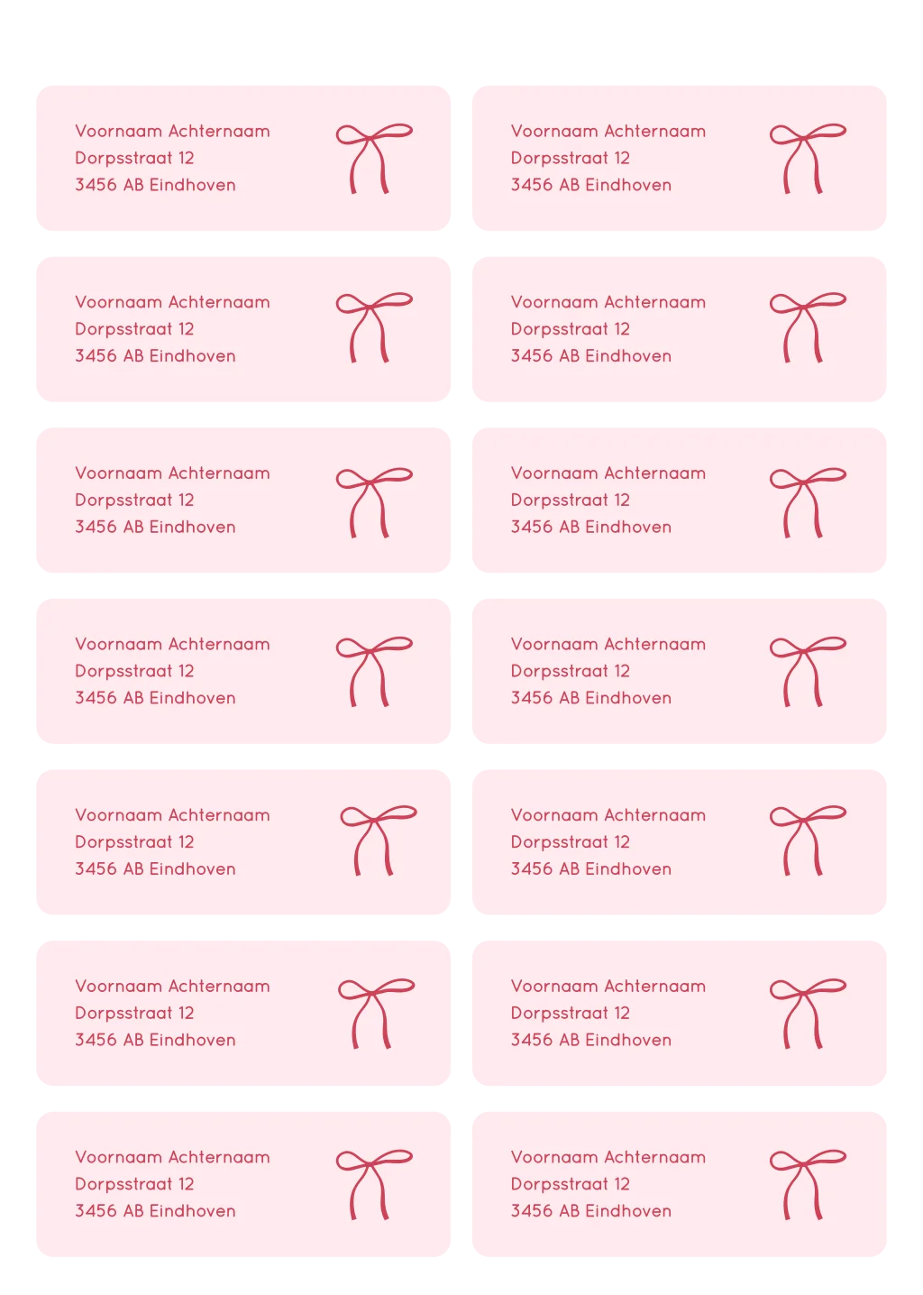 Maak jullie geboortepost uniek en persoonlijk met deze mooie adresstickers. De rood roze kleuren met een sierlijk strikje zorgt voor een stijlvolle touch. Voeg de namen en adressen van je gasten toe en bestel de stickers in de gewenste hoeveelheid. Zo zorg je voor een perfecte presentatie van jullie geboortekaartjes.