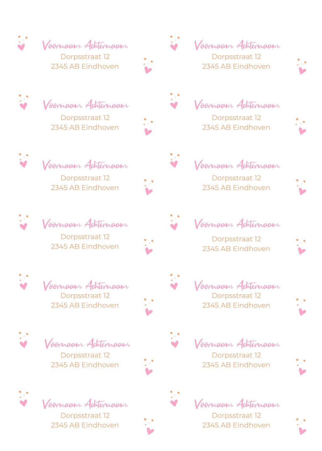 Geef je post een warme en liefdevolle uitstraling met deze prachtige adrestickers in oranje en roze tinten, versierd met schattige hartjes. Perfect voor uitnodigingen, brieven of pakketjes, deze stickers voegen een persoonlijke en stijlvolle touch toe aan je correspondentie.