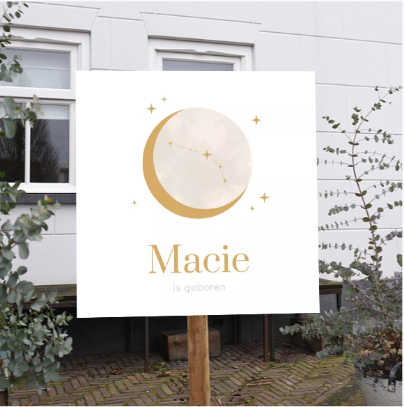 Vierkant tuinbord met een prachtige beige watercolor maan en het sterrenbeeld van jullie pasgeboren baby. Een originele en persoonlijke manier om de geboorte van jullie zoon of dochter aan te kondigen. Combineer het bord met het bijpassende geboortekaartje voor een complete stijlvol geboortepakket.