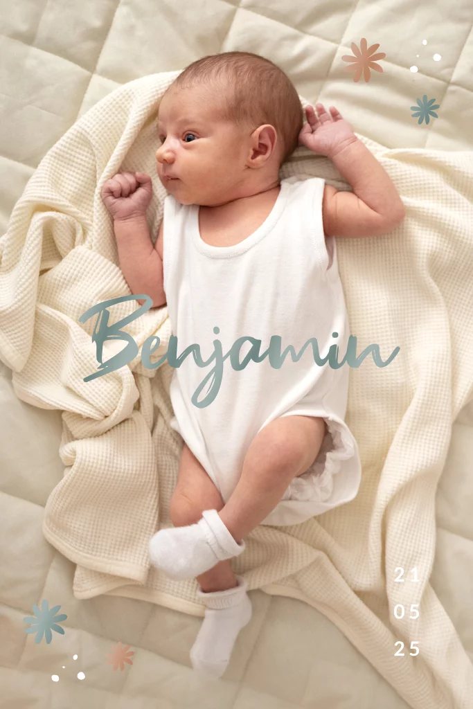 Welkom bij onze collectie van prachtige foto geboortekaartjes! Dit foto geboortekaartje met hoogglans bloemen in blauw en bruin is perfect voor de aankondiging van de geboorte van jullie kleine jongen. De klassieke en romantische uitstraling van dit kaartje zal zeker de aandacht trekken en een blijvende indruk achterlaten bij jullie vrienden en familie. Met de toevoeging van een foto van jullie pasgeboren zoontje, wordt dit geboortekaartje nog persoonlijker en unieker. De combinatie van de rustige en stoere elementen, samen met de vintage en retro uitstraling, maakt dit kaartje geschikt voor diverse stijlen en smaken.