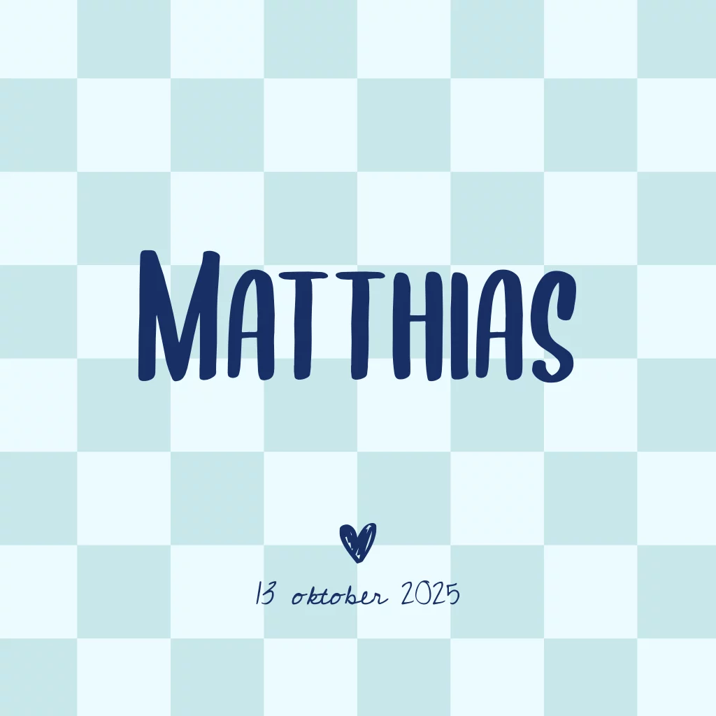 Vier de geboorte van jullie zoontje met dit vrolijke geboortekaartje met blokjespatroon. Het speelse design in frisse, jongenstinten maakt dit kaartje een echte blikvanger. Perfect voor ouders die op zoek zijn naar een moderne en originele aankondiging. Pas eenvoudig de naam, kleuren en tekst aan in onze online editor en maak er een persoonlijk kaartje van. Ideaal voor een stijlvolle, maar toch vrolijke geboorteaankondiging!