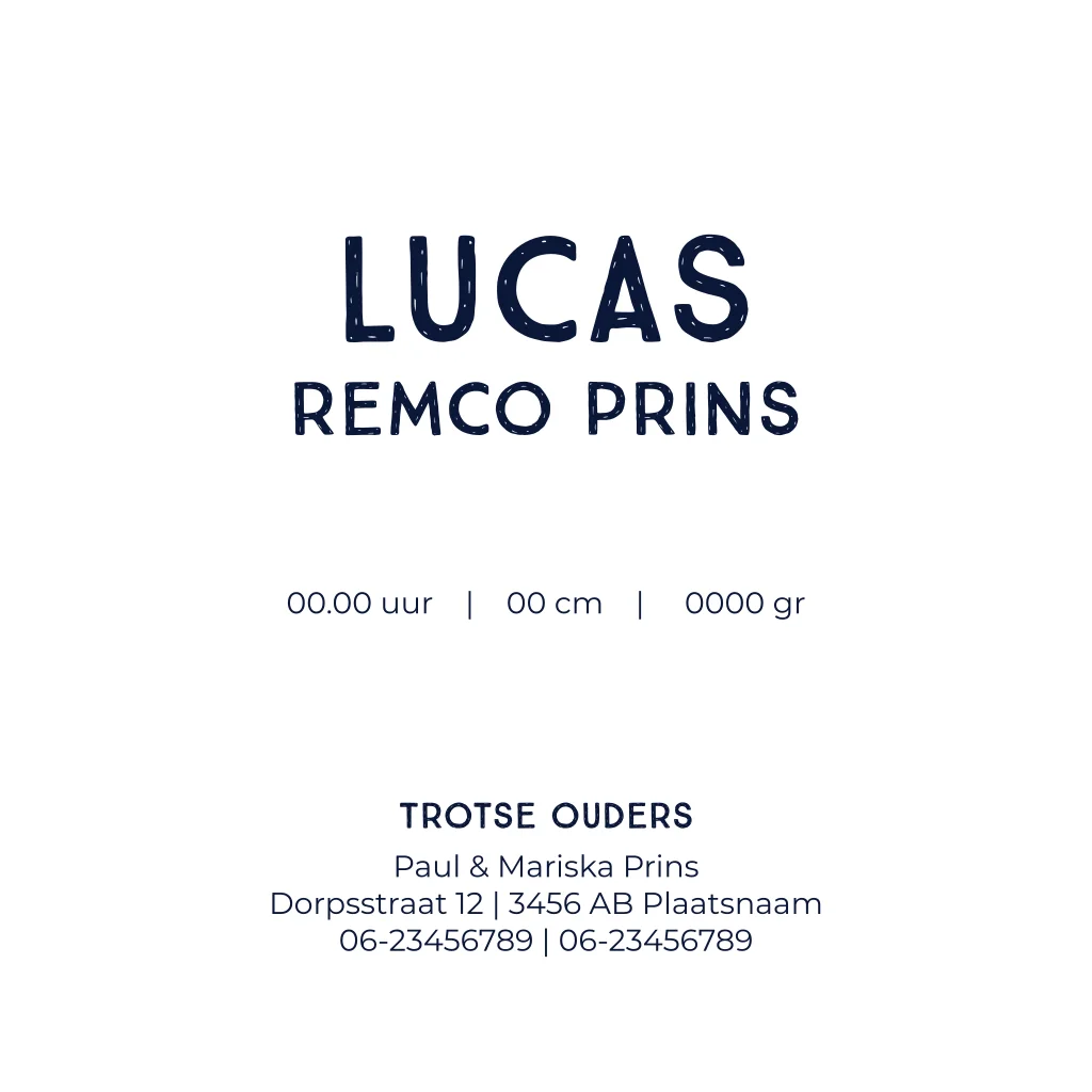 Vier de geboorte van jullie zoon met dit stijlvolle blauw geboortekaartje, voorzien van speelse spetters gedrukt met echt glanzende folie. Pas eenvoudig de foliekleur en achtergrondkleur aan in de editor voor een persoonlijk en uniek ontwerp.