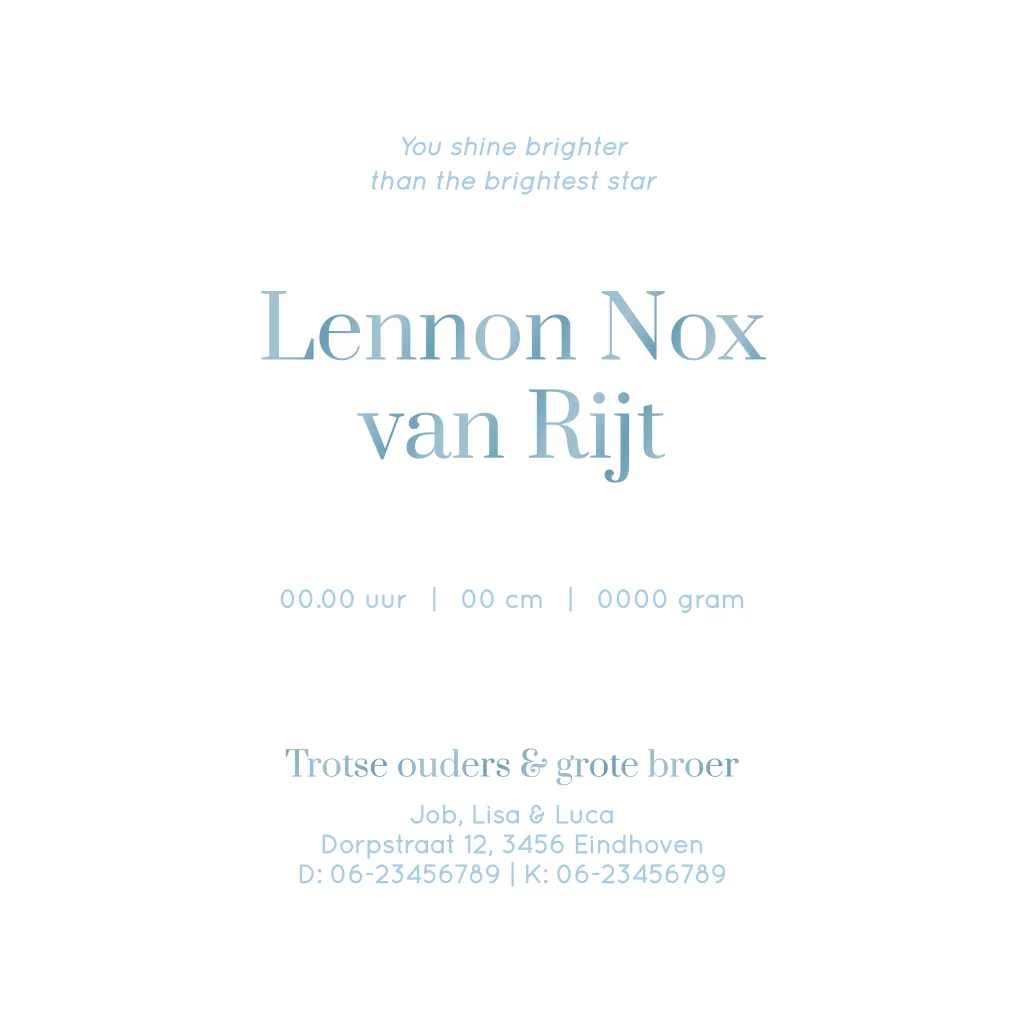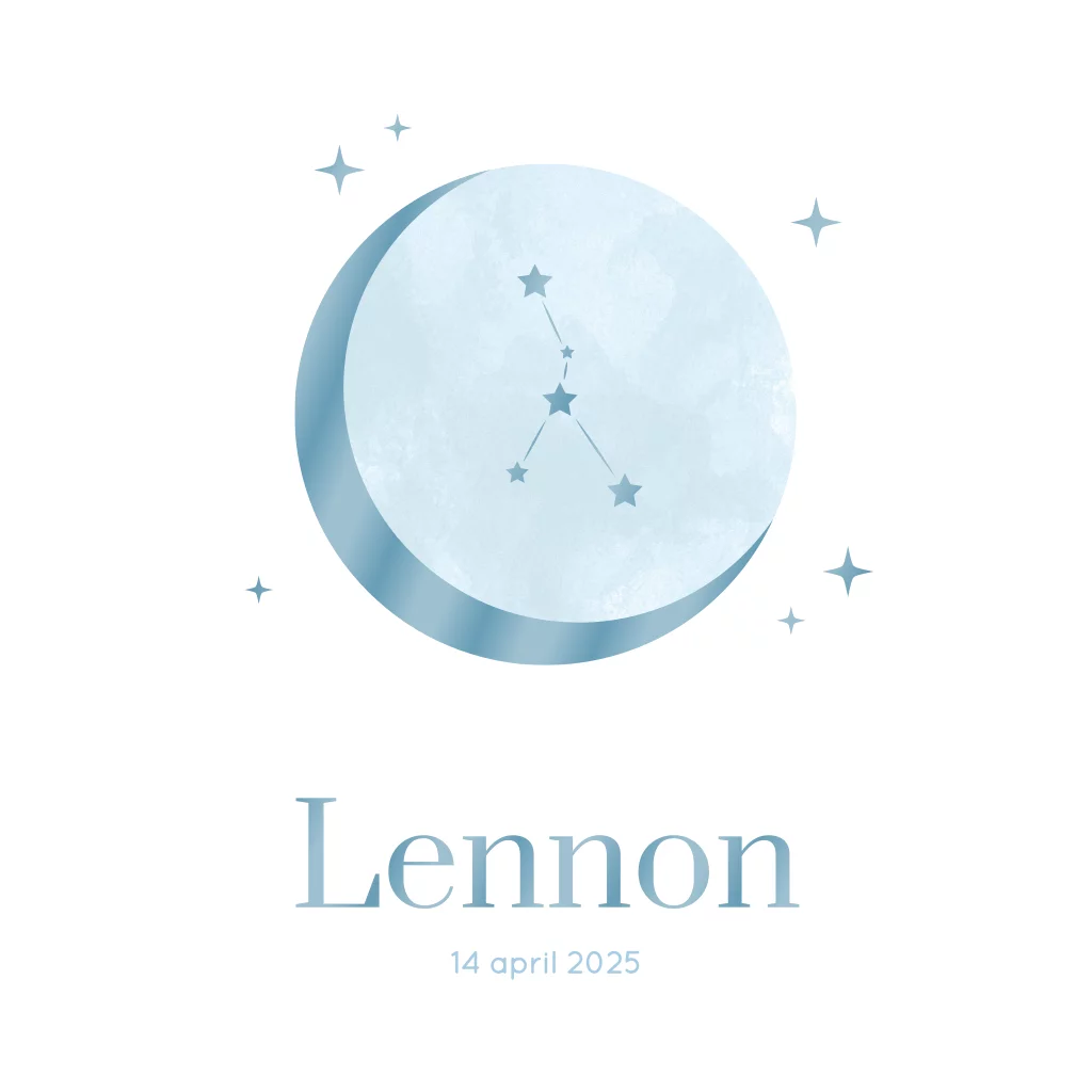 Een uniek geboortekaartje voor jullie stoere zoon! Dit hippe geboortekaartje in hoogglans blauw met een prachtige maan en gepersonaliseerd sterrenbeeld is perfect voor ouders die op zoek zijn naar een trendy en origineel ontwerp. Ook aan te passen naar goudfolie of andere kleuren.