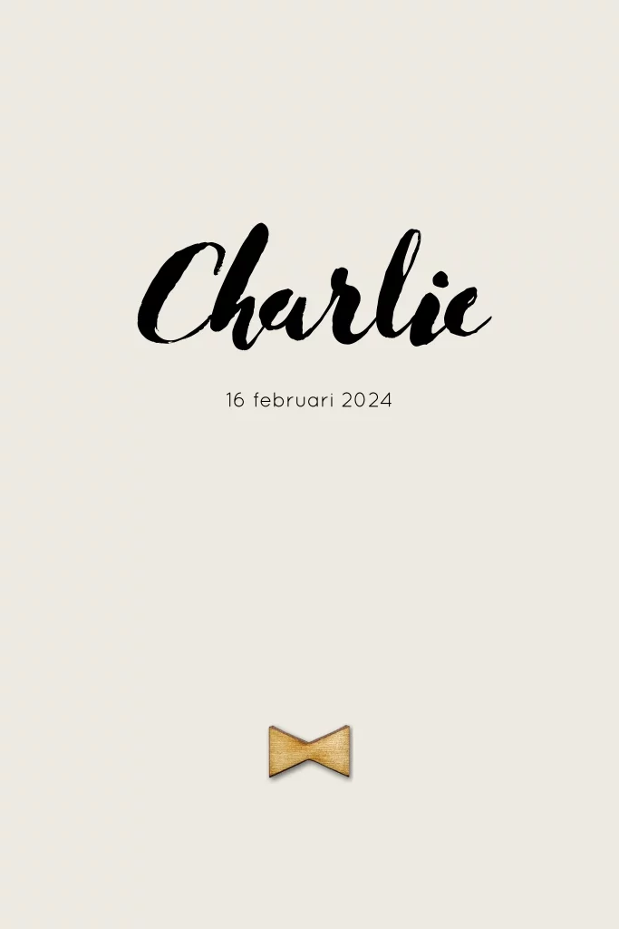 Rustig geboortekaartje voor een jongen met beige achtergrond en een echt houten strikje!