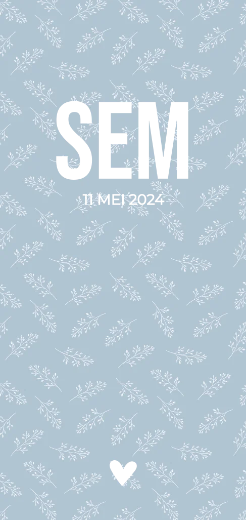 Vier de geboorte van jullie zoon met dit zachte en stijlvolle geboortekaartje, voorzien van een lichtblauwe achtergrond, subtiel takjespatroon en elegante goudfolie details.