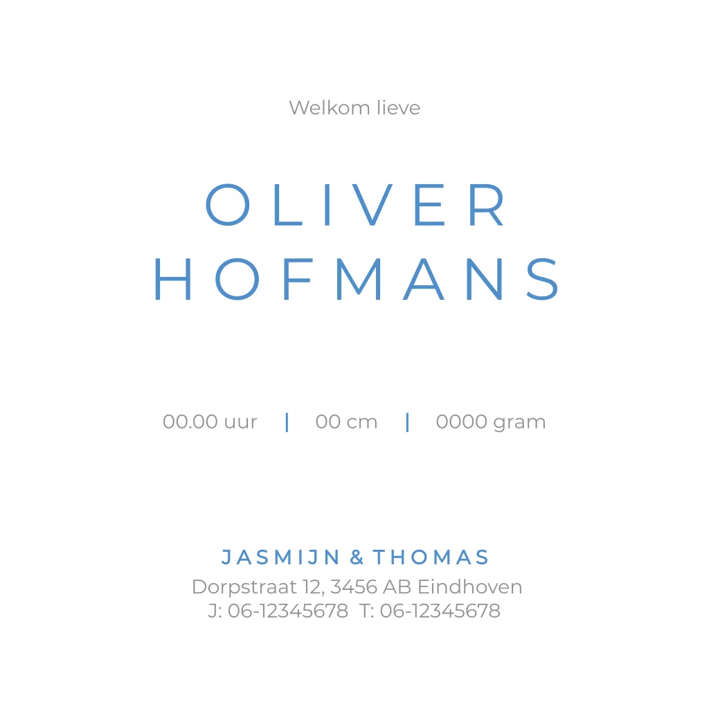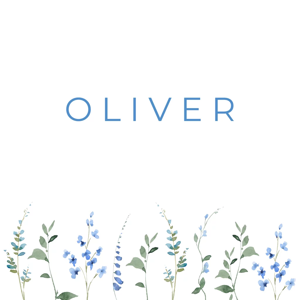 Lief geboortekaartje voor een jongen met geschilderde wilde bloemen in blauwe kleuren. De kleuren & het lettertype pas je gemakkelijk aan. Liever andere bloementjes? Kijk eens in de beeldbank, hier vind je een hele collectie geschilderde bloemen.