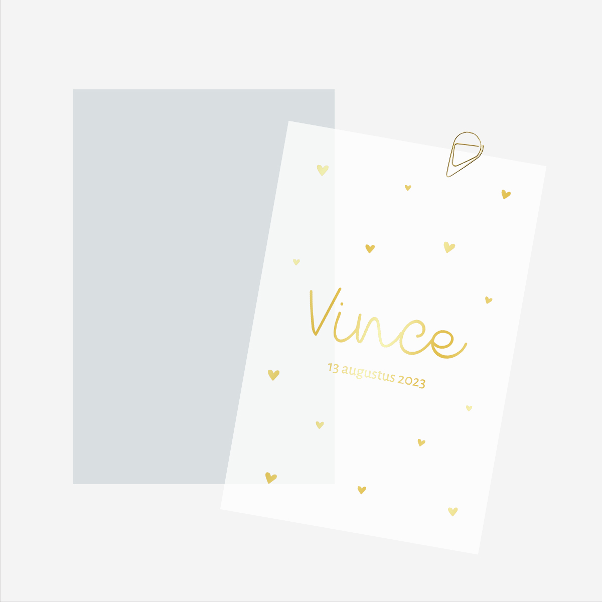 Achterkaart (deel 2) van geboortekaartje met kalkpapier in mooie ijsblauwe kleur met goudfolie. Let op! Er hoort nog een losse kalkpapier voorkant bij deze kaart. Je besteld dus 2 kaarten > Kalkpapier voorkant + achterkaart.
