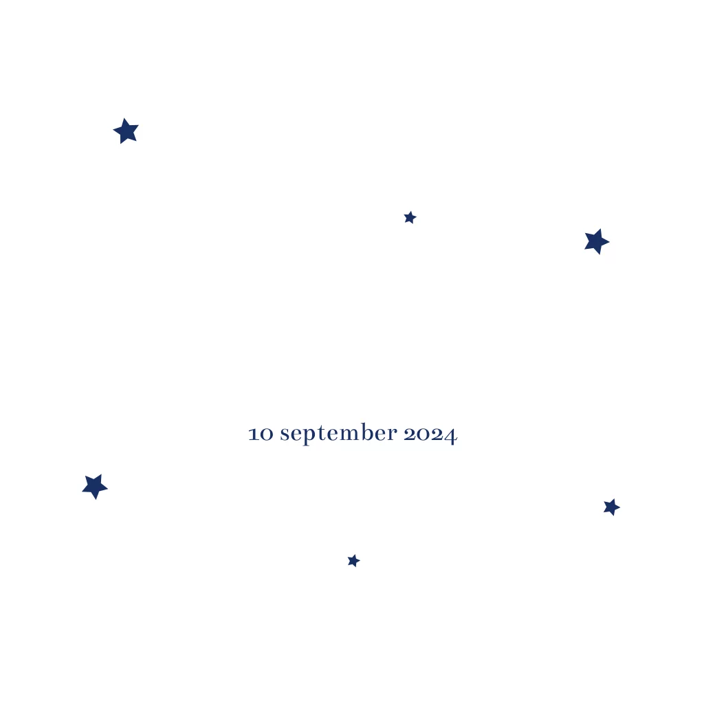 Schattig geboortekaartje met blauw en goudfolie sterretjes voor in een pockterfold mapje.