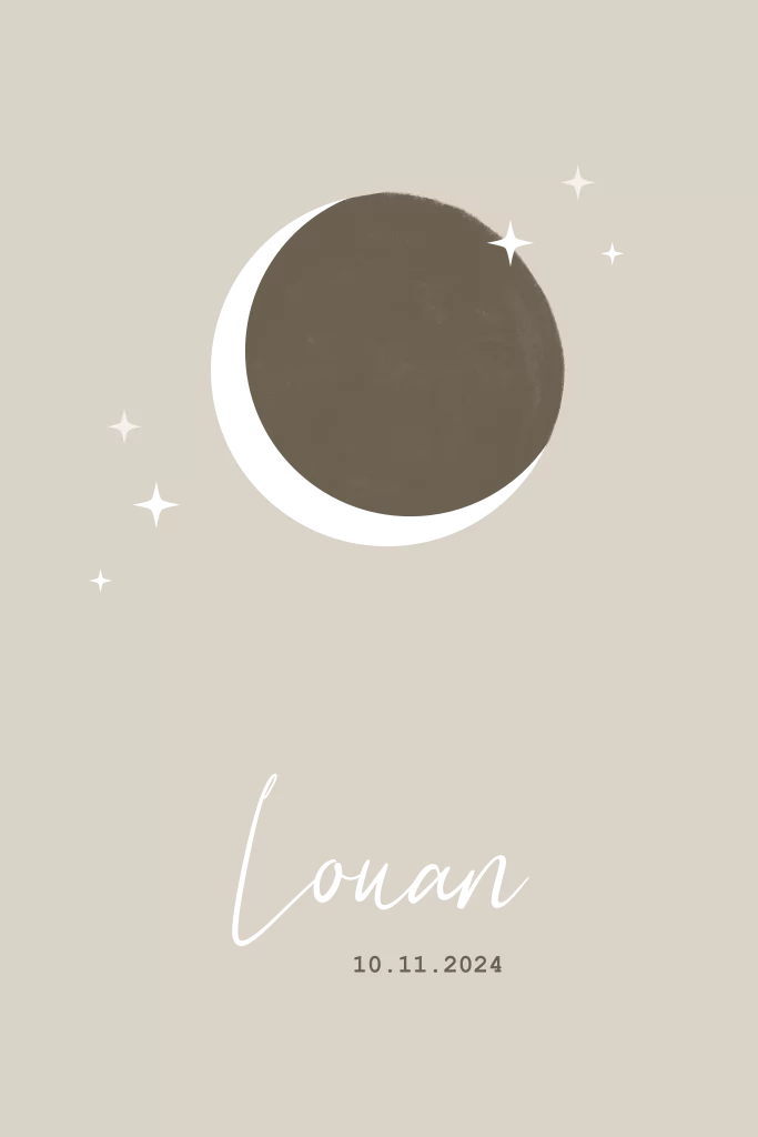 Dit minimalistische ontwerp straalt een stoere en tegelijkertijd elegante uitstraling uit, perfect voor de aankondiging van de geboorte van jullie zoon. De combinatie van de warme bruine tinten en de glinsterende goudfolie accenten zorgt voor een unieke en luxe uitstraling. De toevoeging van de maan en sterretjes geeft het geboortekaartje een speels en dromerig karakter, waardoor het perfect past bij de viering van nieuw leven.