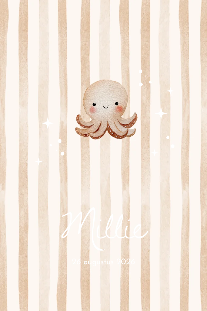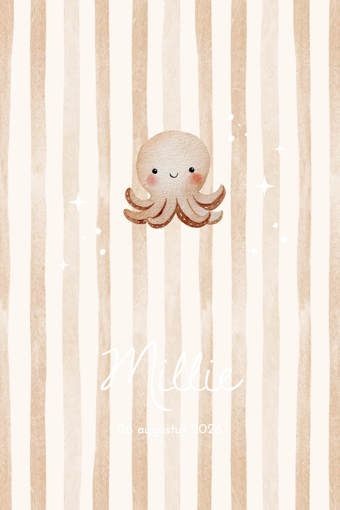 Lief geboortekaartje met trendy aquarel strepen en een bruin, beige baby octopus. De koperfolie n aam en sterretjes geven het ontwerp een luxe en bijzondere uitstraling. Ontwerp zelf aan te passen naar wens. Ook mogelijk in andere formaten en vormen, stuur een berichtje voor meer informatie.