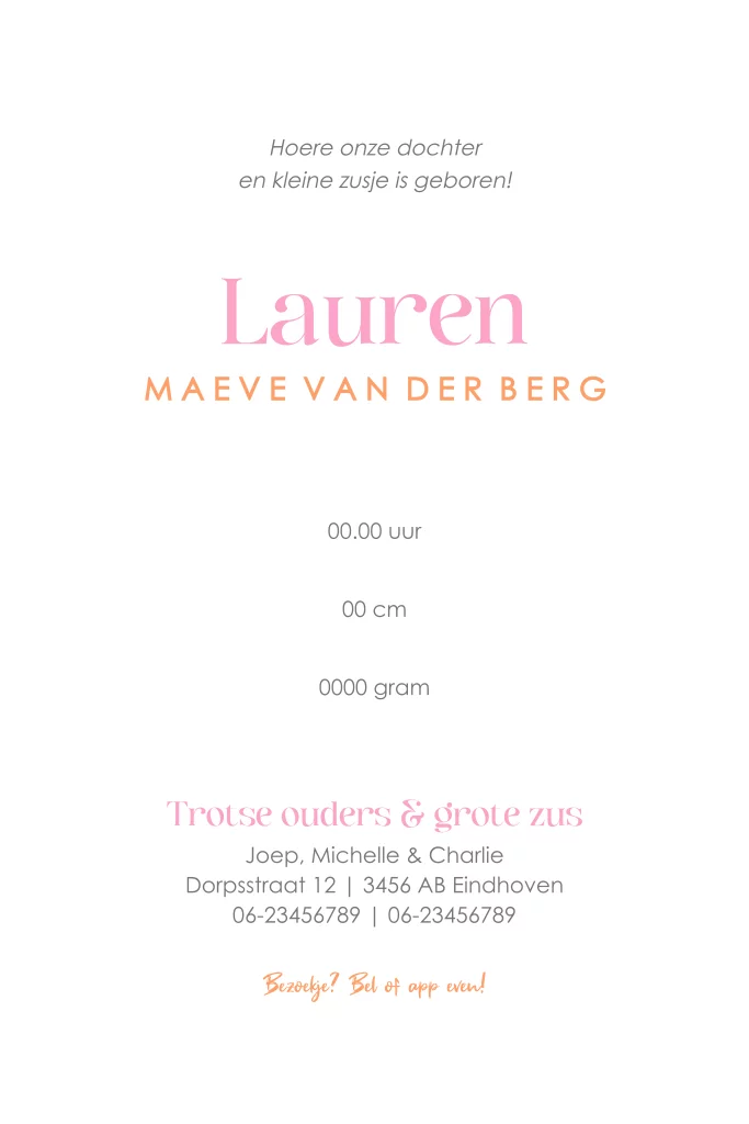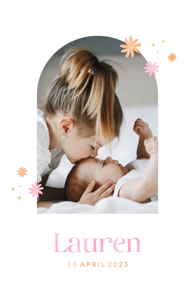 Vrolijk en lief gevouwen geboortekaartje met boogvorm foto en kleurrijke hoogglans bloemen in roze oranje tinten. met liefde ontworpen voor een prachtig klein meisje. Ruimte voor een foto van jullie kleine wonder samen met grote broer of zus. Kleuren en lettertypes zijn aan te passen naar wens.