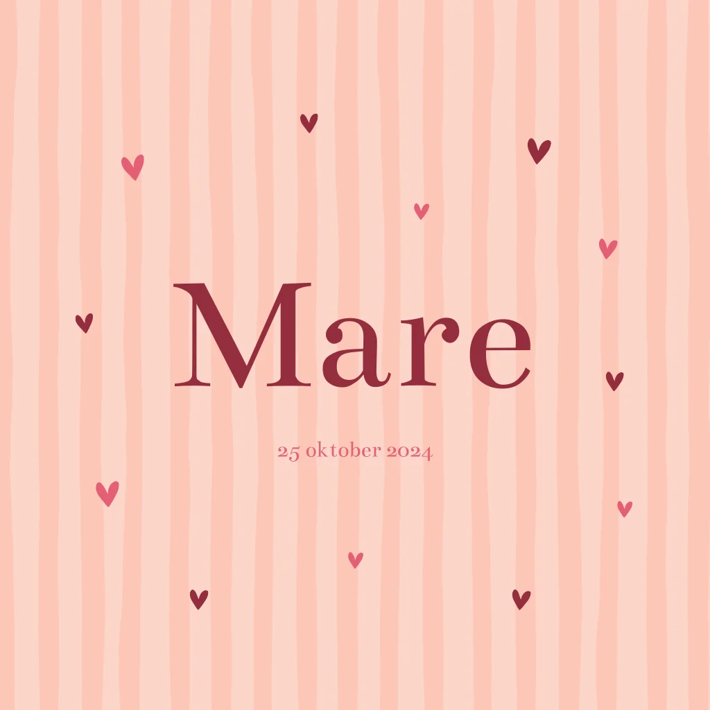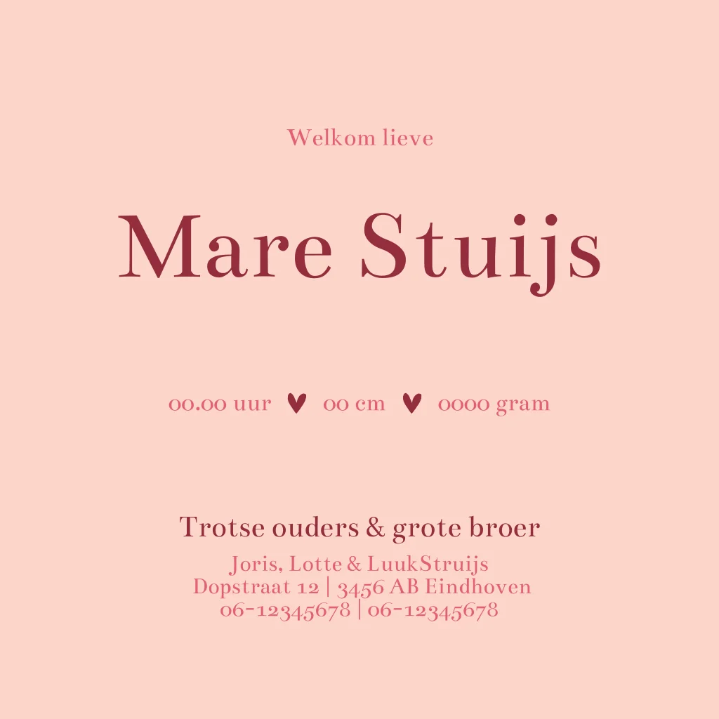 Vrolijk geboortekaartje voor een meisje met handgetekende hartjes. Op zoek naar iets echt unieks en persoonlijks? Laat de hartjes dan tekenen door de grote zus of broer. Meer info over de mogelijkheden hiervan? Stuur een bericht via het contactformulier