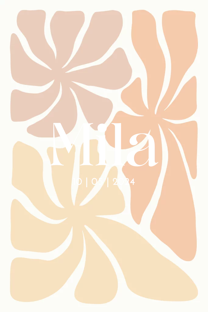 Een heel uniek geboortekaartje voor een meisje met een trendy print, peachy abstracte bloemen met goudfolie. Ondanks de print en de mooie kleuren is het kaartje rustig qua opmaak. Heb je deze kaart liever in andere kleuren? Geen enkel probleem, pas de kaart gemakkelijk aan in de editor.