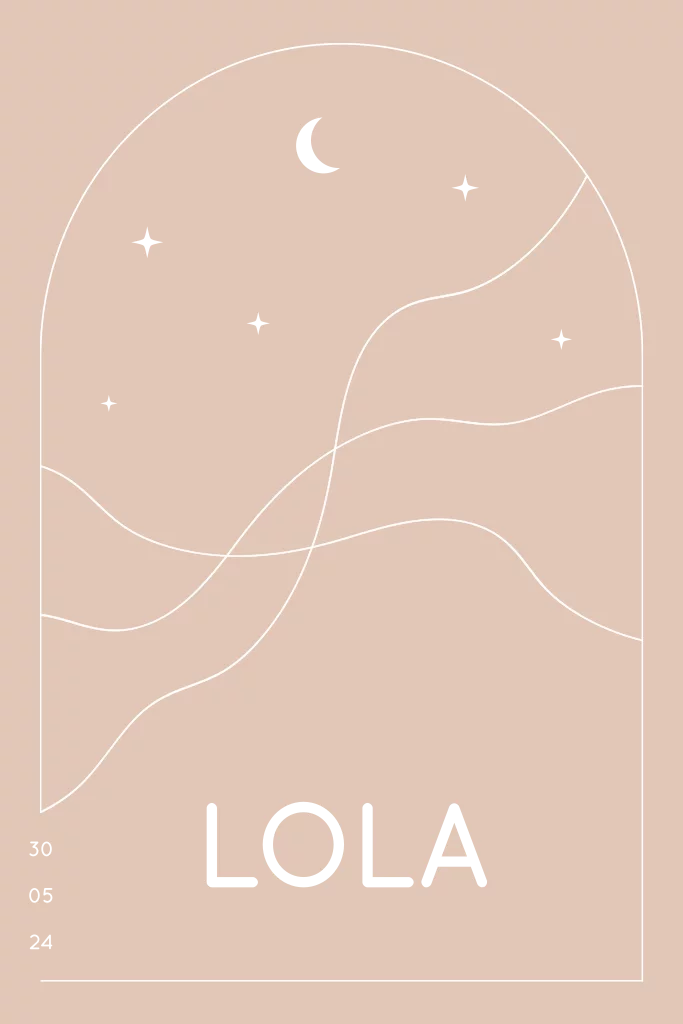 Lief geboortekaartje voor een meisje met abstracte boogvorm lijnen en goudfolie maan en sterretjes.