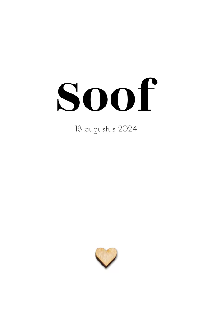 Neutraal geboortekaartje met een rustig ontwerp en een echt houten hartje!