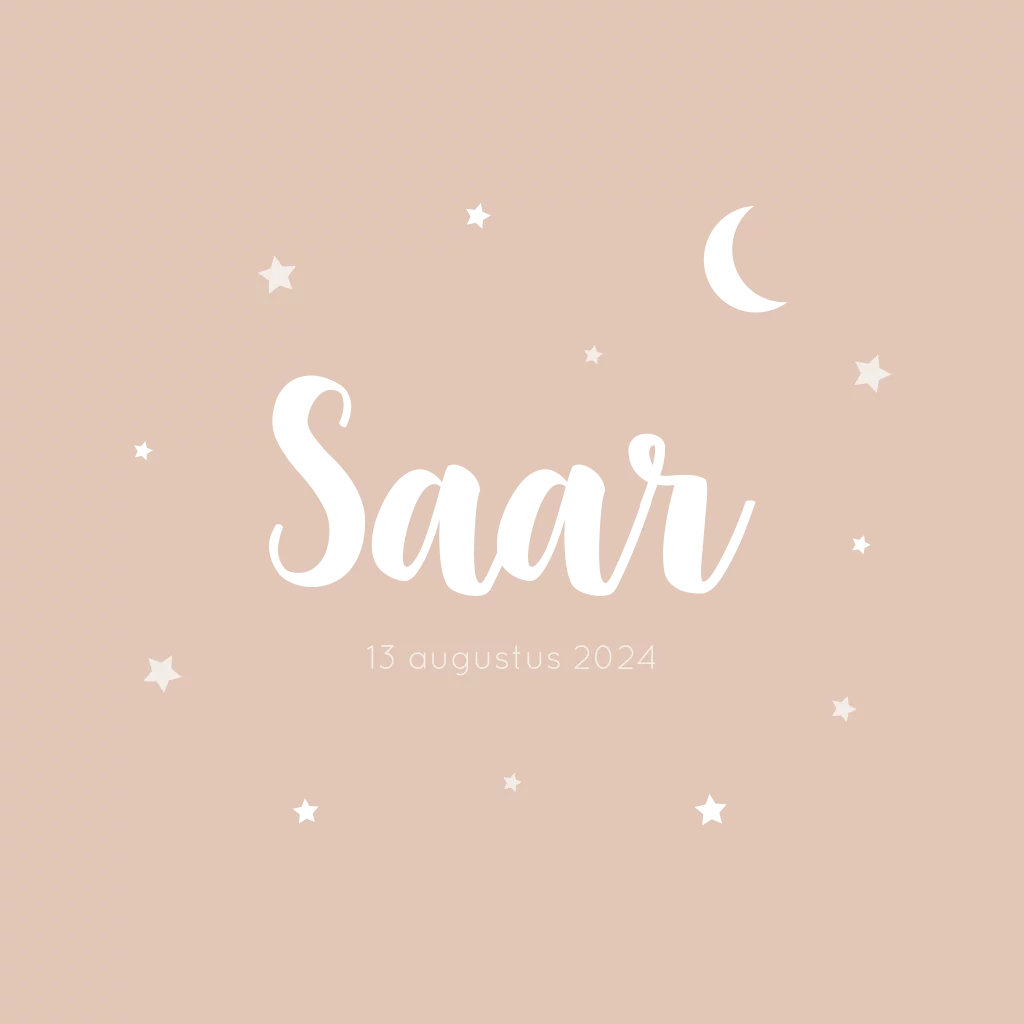 Lief geboortekaartje voor een meisje in zacht roze kleur met goudfolie maan en sterretjes.