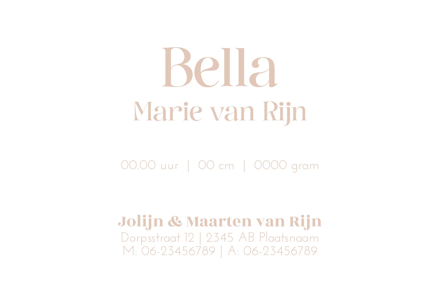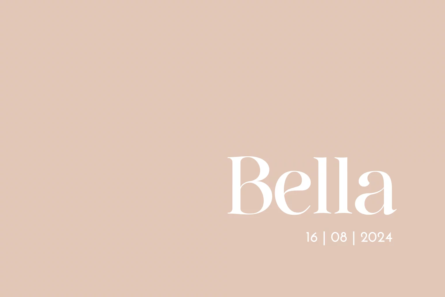 Minimalistisch geboortekaartje voor een meisje met elegante hoogglans witte details voor de naam en geboortedatum. Houd je van wat meer kleur? Pas de achtergrond, folie en typografie eenvoudig aan naar wens in onze gebruiksvriendelijke editor. Een stijlvol en persoonlijk ontwerp om de geboorte van jullie dochter aan te kondigen.