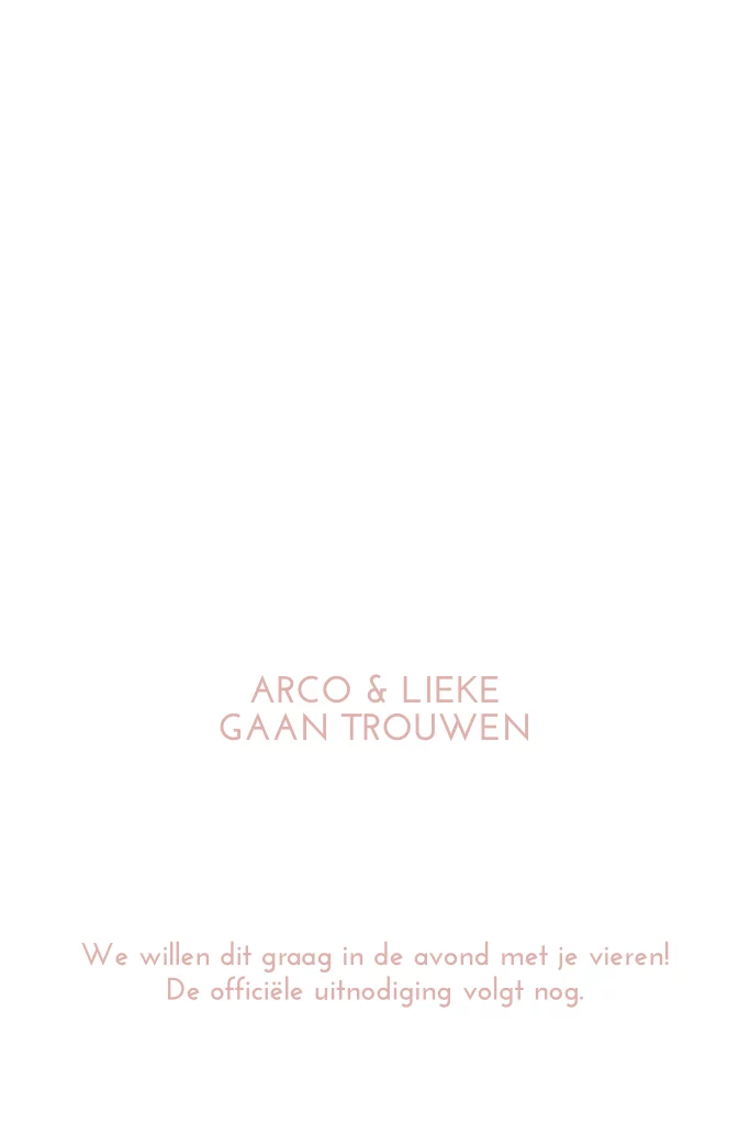 Prachtige save the date kaart voor jullie avondgasten met leuke woordspeling, save the night. Gedrukt op transparant kalkpapier met rosefolie. Bij deze save the date kaart hoort een bijpassende trouwkaart en sluitsticker. Liever geen kalkpapier maar een gekleurde achtergrond? Geen probleem, stuur me even een berichtje en ik zet het aangepaste ontwerp voor je klaar.