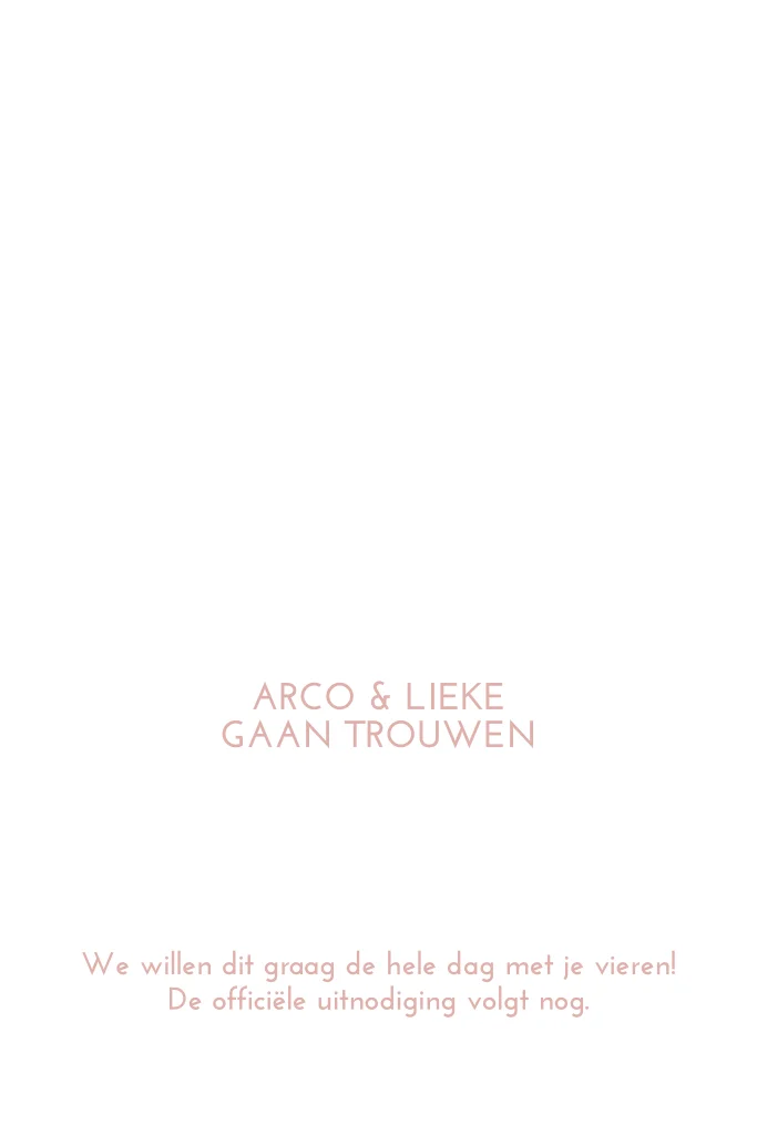 Prachtige save the date kaart voor jullie daggasten. Extra bijzonder door het transparante kalkpapier en glanzende rosefolie. Bekijk ook de aangepaste versie voor jullie avondgasten. Liever een ander papiersoort of formaat? Stuur me even een berichtje en ik pas het ontwerp gratis voor je aan.