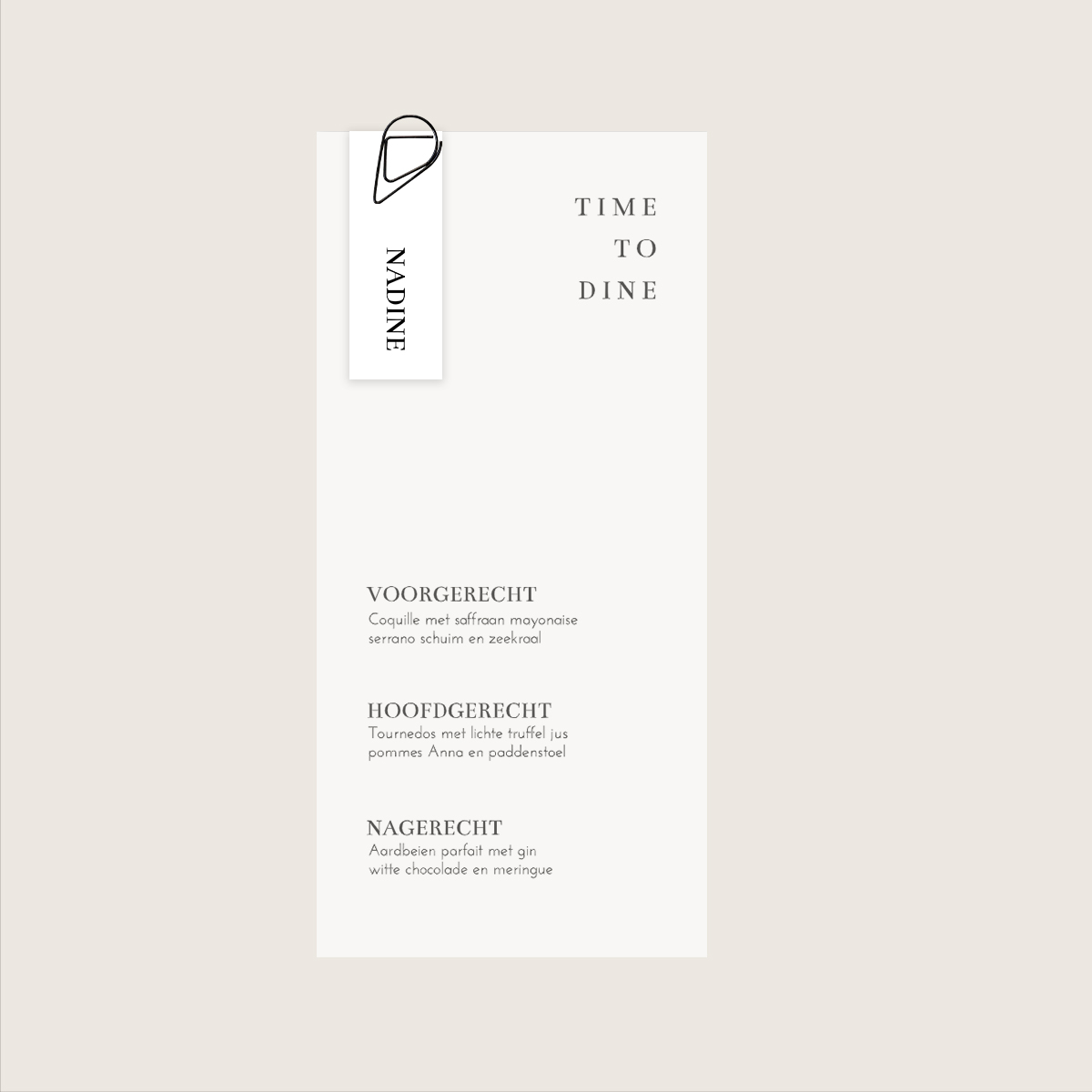Voeg een verfijnde touch toe aan jouw diner of bruiloft met onze luxe menukaart, gedrukt op semi-transparant kalkpapier. Deze elegante menukaart straalt klasse uit en is perfect voor speciale gelegenheden. Aan de linkerbovenhoek kun je eenvoudig een bijpassend naamkaartje bevestigen met een stijlvolle gouden paperclip – een chique en persoonlijke finishing touch.