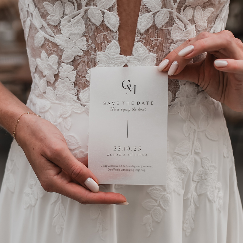Minimalistisch Save The Date kaartje gedrukt op elegant kalkpapier, pas het ontwerp eenvoudig aan in onze online editor.