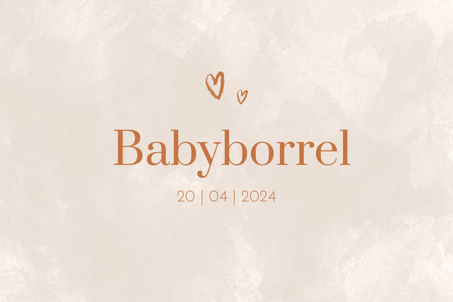 Deze moderne en trendy babyborrel kaart is perfect voor ouders die houden van een uniek ontwerp. De combinatie van de zachte beige kleur en koperkleurige hartjes zorgt voor een opvallende en luxueuze uitstraling. Op de voorkant staat de datum van jullie babyborrel in een strak lettertype, terwijl de achterkant is gereserveerd voor aanvullende informatie over de babyborrel aan jullie gasten. Personaliseer de kaartjes met jullie eigen tekst en creëer een babyborrel kaart die perfect past bij jullie stijl.