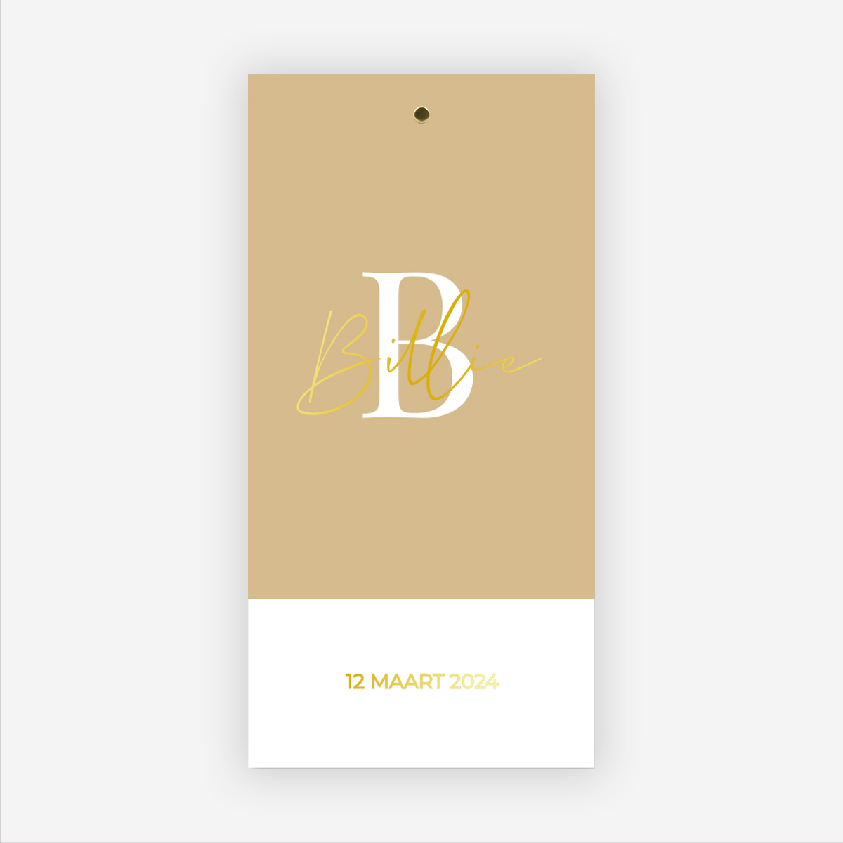 Lief label geboortekaartje met initiaal in mooie mokka kleur. De naam is in een prachtig sierlijk lettertype geschreven en gedrukt met glanzend goudfolie. Een super tof effect geeft dit aan de kaart. Niet zo een fan van de kleuren? Geen probleem, je kunt in de editor alles helemaal naar eigen wens aanpassen.