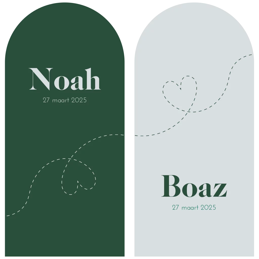 Twee aparte kaartjes voor een tweeling waarvan de stippellijn hartjes precie sin elkaar overlopen. Een mooie symbool voor de geboorte van jullie tweeling. Allebei een eigen kaartje en toch ook weer samen. De kleuren en lettertypes pas je gemakkelijk zelf aan.