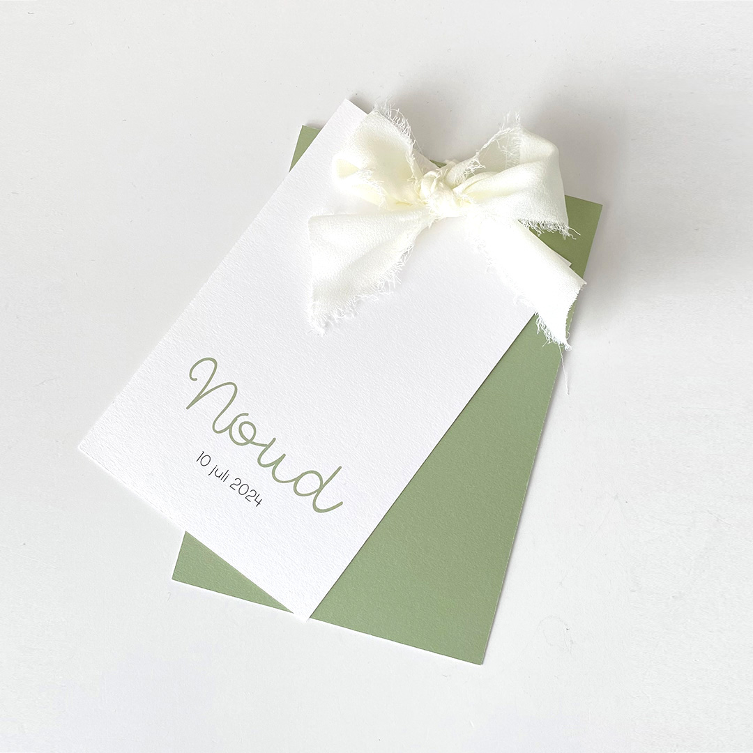 Geboortekaartje labelkaart olijfgroen zijden lint